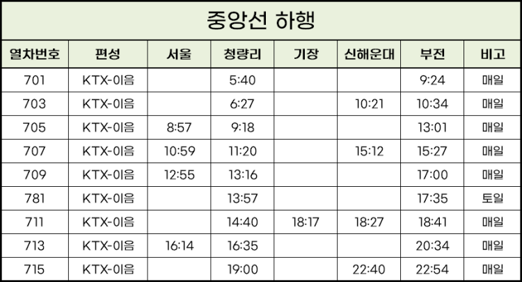 서울에서 출발해서 기장역을 정차하는 중앙선 KTX 열차는 청량리역에서 1일 1회(KTX 711열차 : 청량리 14:40 > 기장 18:17)만 이용이 가능합니다.