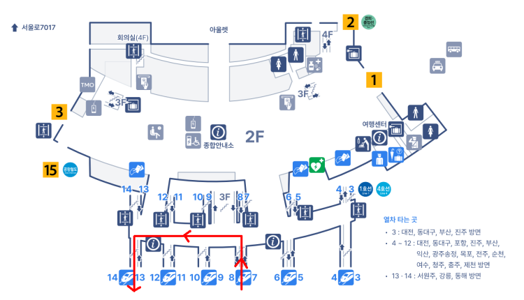 KTX를 타고 서울역에 도착한 다음, 계단 등을 이용해서 2층 맞이방 나가는 쪽으로 올라갑니다. 다만 여기서 맞이방(건물 내부) 쪽으로 들어가지 말고 선상통로(선로 위를 지나다니는 길)를 이용해서 갈아탈 KTX-이음 845열차의 출발 승강장(1층, 13/14번)으로 다시 내려가면 되는 형태입니다(같은 건물에 승강장만 다름).