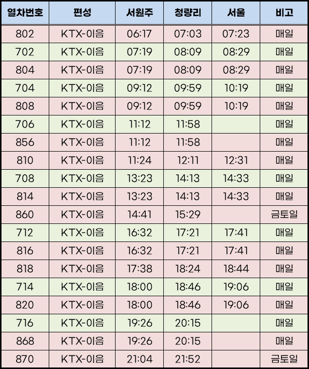청량리역으로 가는 막차는 평일에는 서원주역에서 오후 7시 26분 출발하는 KTX 868열차이며(청량리역 8시 15분 도착), 금~일요일에는 오후 9시 4분 출발하는 KTX 870열차입니다(청량리역 9시 52분 도착).